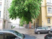 Und als letztes von dieser Stelle noch ein weiteres Bild aus Pumuckl und der Nikolaus. Wieder ein paar Kinder, diesmal auf der Suche nach oder der Flucht vor dem Nikolaus. Sie entdecken einen Mann, der es sein könnte und der auf der anderen Straßenseite gegenüber dem Vorderhaus entlangläuft. Etwas später sieht man die selbe Einstellung nochmals, mit etwas mehr Drumherum. Im frühabendlichen Dunkel der Nikolausfernsehfolge erkennt man im linken Bild begrünte Hofeinfahrten mit einer Backsteinmauer und schmiedeeisernem Tor. Unser Foto vom März 2004 zeigt sie daneben im nachmittäglichem Sonnenschein und sie liegen in der Tat genau gegenüber der beim Dreh verwendeten Vorderhausfassade in der Tattenbacher Straße. Inzwischen (2009) steht auf der damals noch freien, großen Fläche links von der Backsteinmauer ein Neubau; und von der Backsteinmauer musste das vordere Stück einem Gitter weichen, wohl damit man aus der Ausfahrt des Neubaus einen besseren Seitenblick auf die Straße hat. Das Vorderhaus bei |