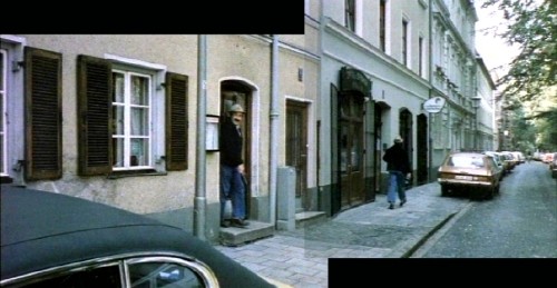 Die Hofeinfahrt (hier aus der Folge Der große Krach) und der darüber liegende Balkon, wieder zu sehen in der Folge Der erste Schnee, sind ebenfalls noch identisch vorhanden, wie das dazwischen liegende "Beweisfoto" zeigt. Die hoftrennende Mauer, die beim Ausblick aus der Werkstatt neben dem Kellerabgang den Blick auf das Vorderhaus und die davor geparkten Autos versperrt, ist nur für die Dreharbeiten aufgestellt worden und gehörte nicht zum ursprünglichen Hof. Besonders bei Aufnahmen in der Werkstatt, bei denen man im Hintergrund aus dem Fenster sehen kann, ist diese Mauer nicht immer vorhanden, so dass man gelegentlich tatsächlich die Autos sehen kann (vgl. Goofs). Dass diese Mauer völlig frei steht, und vor der Kellertreppe wieder endet sieht man sehr gut in der Einstellung aus Eders Küchenfenster (Bild ganz rechts) in der Folge Der verhängnisvolle Schlagrahm als Eders Cousine und Fritzl nach dem üppigen Kaffeetrinken erstmals gehen. Am rechten Ende der Mauer ist an den weißen Parkplatzmarkierungen deutlich zu erkennen, dass die Mauer nur ganz dünn ist und ihre Oberkante lediglich aufgesetzt. Das rechte Ende der Mauer kann man noch in weiteren Folgen sehen, wie z.B. Auf heißer Spur. Der Hof bei